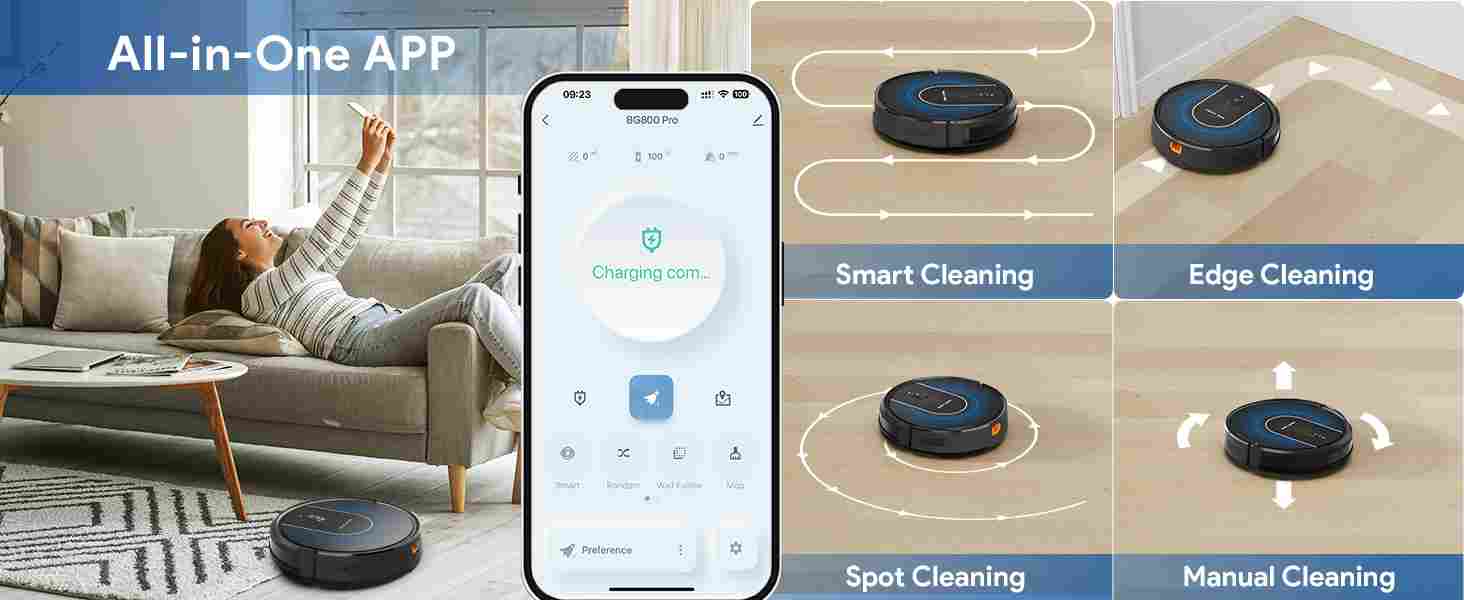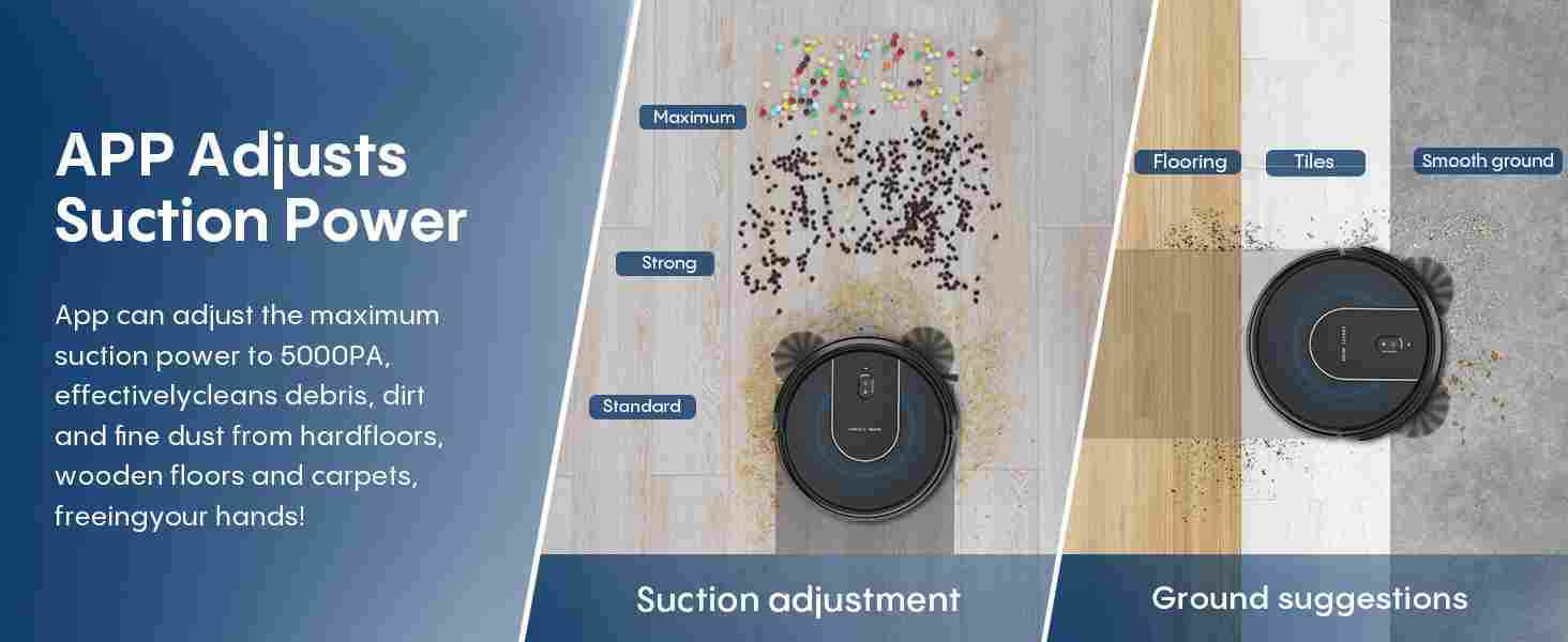 【2.4GHz WiFi & Smart App & Voice Control】 ➤ Free your hands to the full extent, simple and convenient! 800Pro robotic vacuums works with App、Alexa, and Google Assistant. You can monitor cleaning paths, adjust suction level, adjust water output, scheduled cleaning, change cleaning modes, like auto(Zigzag), spot, edge, mop and more via the App. Note: Unable to connect to 5GHz WiFi.