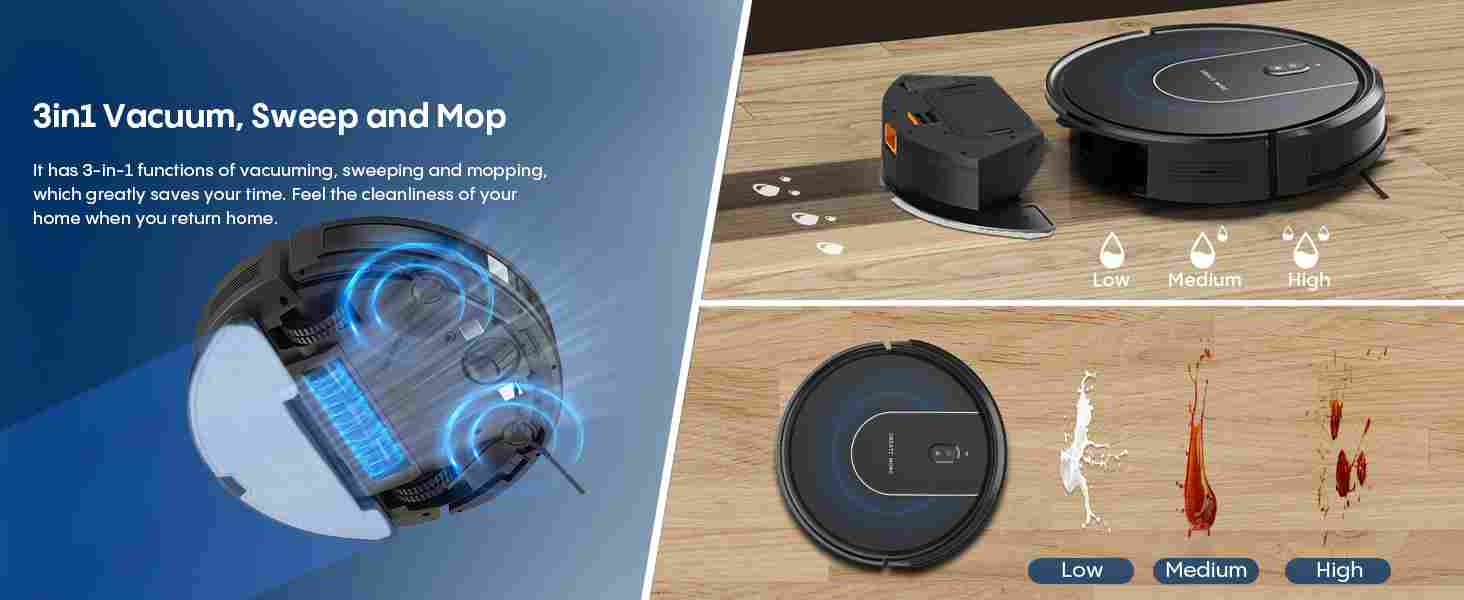 【3 in 1 & Mopping System】➤ Robot vacuum cleaner with mop provides sweeping, rolling, vacuuming and mopping functions. The mopping system with intelligent control water tank can adjust the low, medium, and high water volumes in real-time to achieve better washing results.
