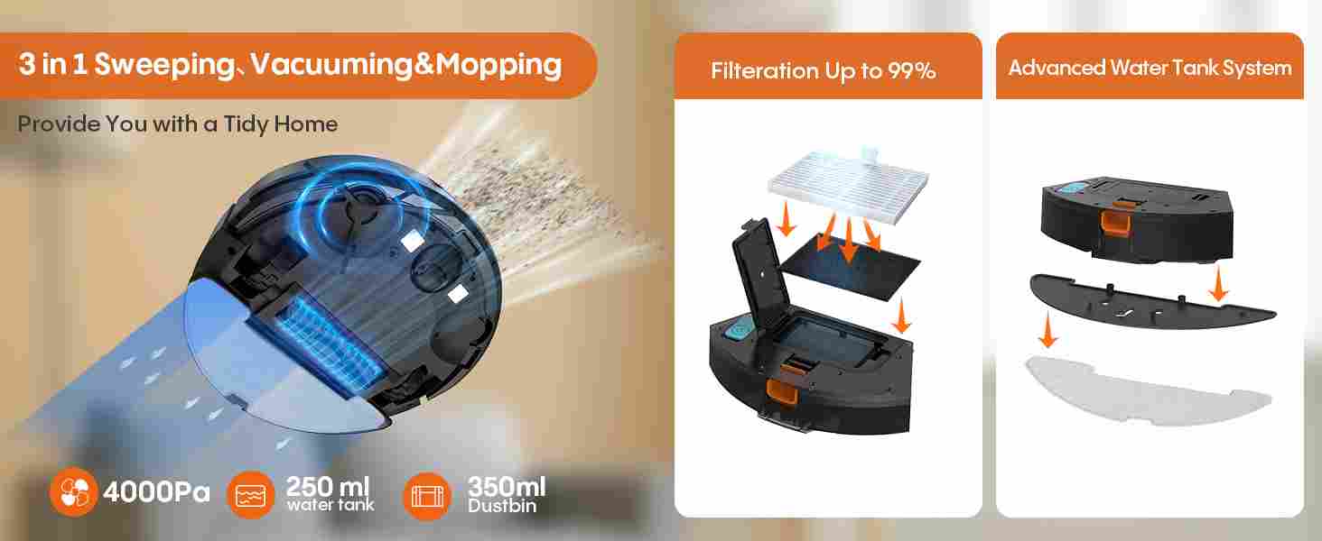 【4 in 1 Sweep, Vacuum, Mop and Self-Emptying】Robot Vacuum Cleaner and Mop Combo can Sweep, Vacuum, Mop the floor and automatically collect dust, providing a comprehensive cleaning solution in one device. Freeing your hands and enjoying the convenience.