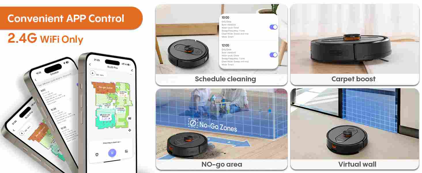 【Smart App and No-go Area】You can set a personalized cleaning schedule through the app to meet your different cleaning needs. Cleaning time, suction power, and cleaning mode are available for you to choose. You can also create restricted areas to prevent the robot vacuum cleaner from entering.