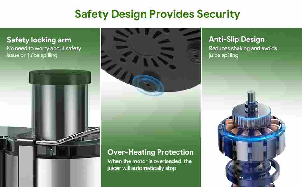 【Safety Lock Design】The safety lock and non-slip feet are specially designed to ensure your safety during use, and easy to operate. Overload protection that automatically shuts down the machine when the machine is overloaded.It's a very safe juicer.