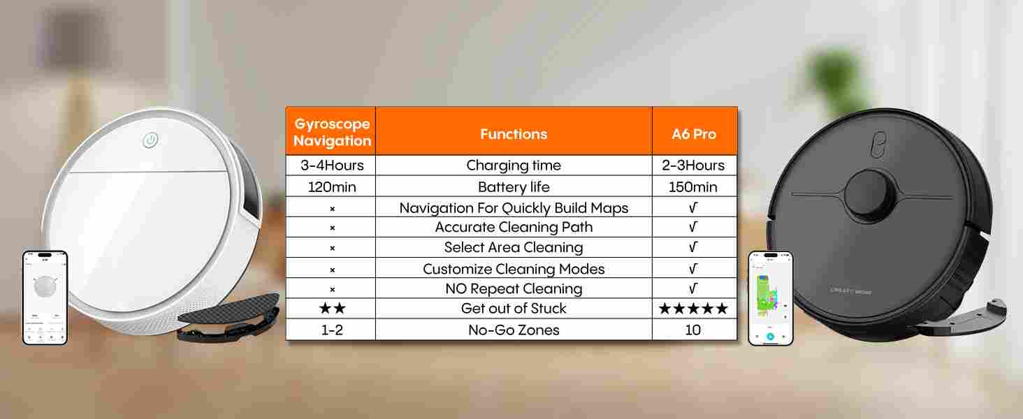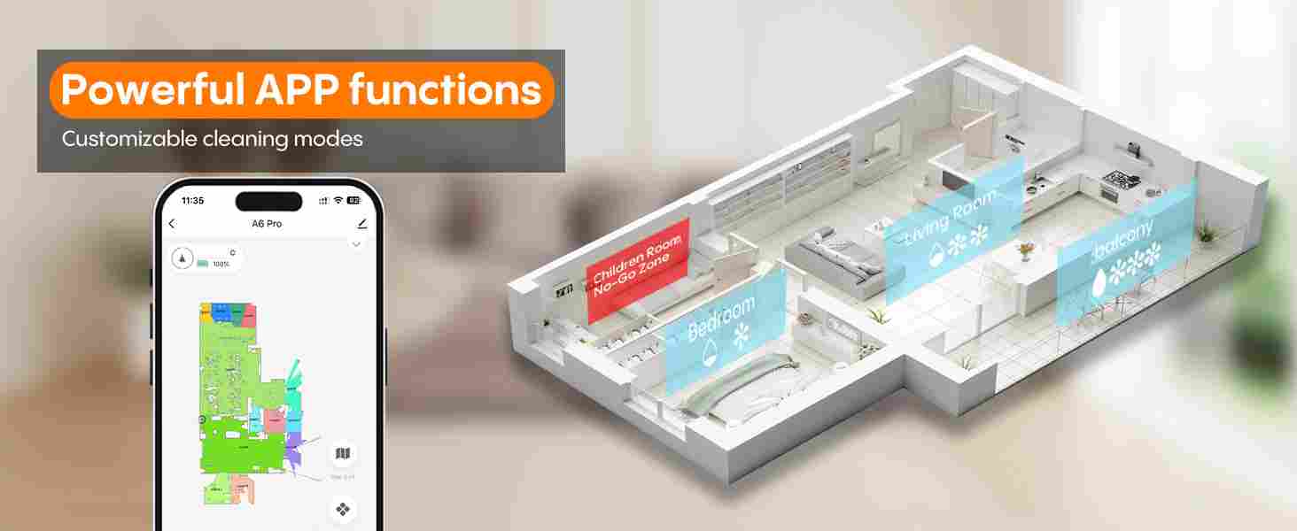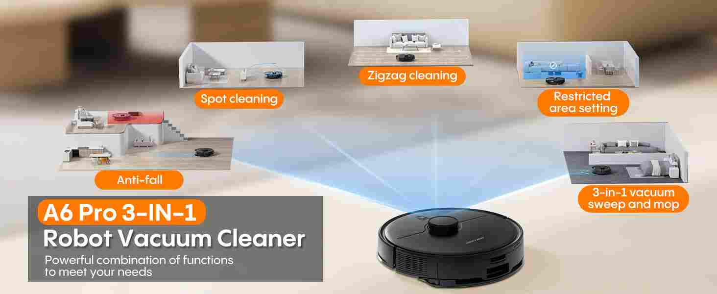 【360° LiDAR Precision Mapping and Navigation】Experience next-level cleaning with the A6pro robot vacuum and mop combo, powered by state-of-the-art LiDAR mapping technology. This intelligent cleaning system performs 360° laser scanning to accurately map your home's layout, delivering 70% more cleaning efficiency than traditional vacuum cleaners.