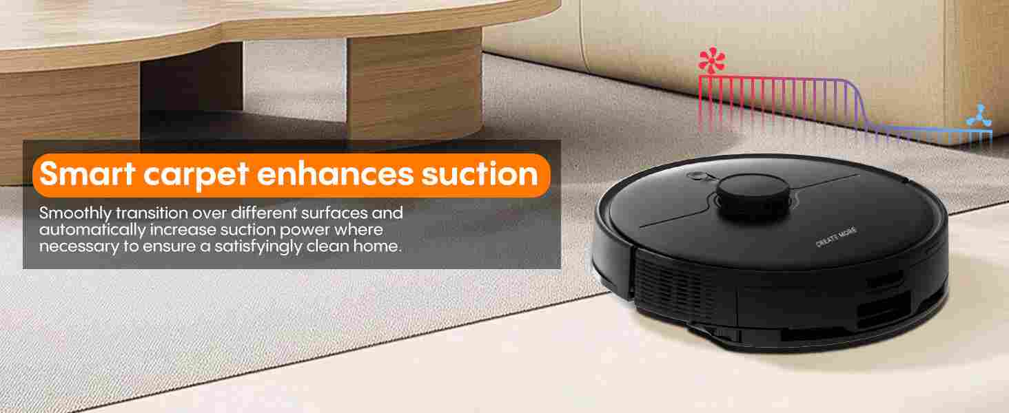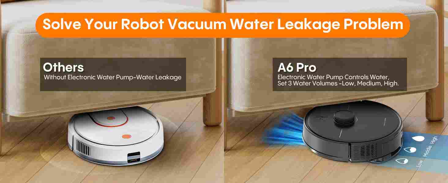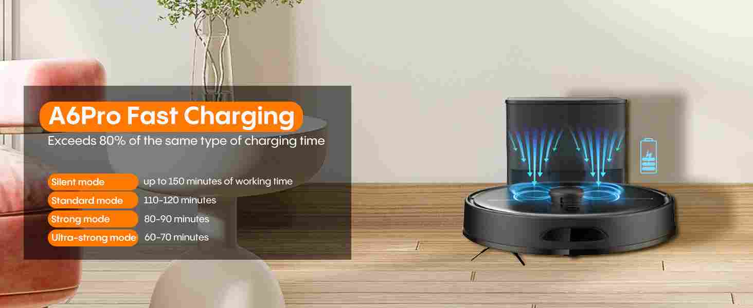 【5000PA Suction & Rapid Charging】The A6Pro robot vacuum and mop combo delivers ultra-strong 5000Pa suction power, effortlessly lifting home debris, pet hair, and deep-set dust from both hard floors and carpets. Plus, with 50% faster charging than comparable models, the spends more time cleaning and less time docked—keeping your floors spotless around the clock.