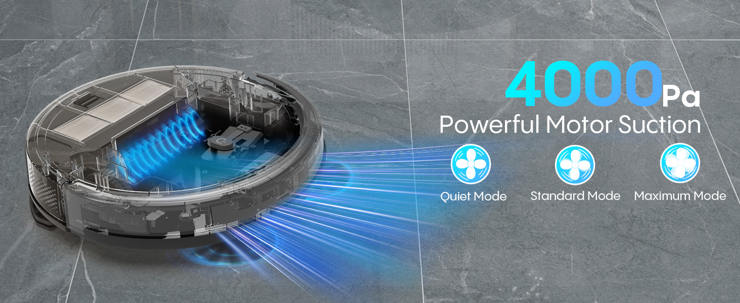 【4000Pa Super Strong Suction】The robot vacuum cleaner delivers deep-cleaning strength, effortlessly lifting debris, pet hair, and embedded dust,and the dual rotating side brushes are designed to suck in debris from corners and edges.