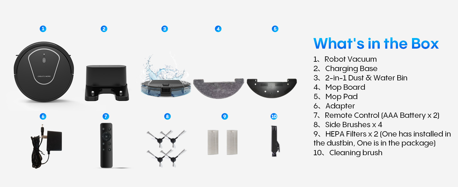 【2-in-1 Robot Vacuum and Mop】The robot vacuum combination can sweep, vacuum and mop the floor, providing a comprehensive cleaning solution in one device, wet and dry cleaning, to meet different cleaning needs, saving time and energy for daily cleaning.