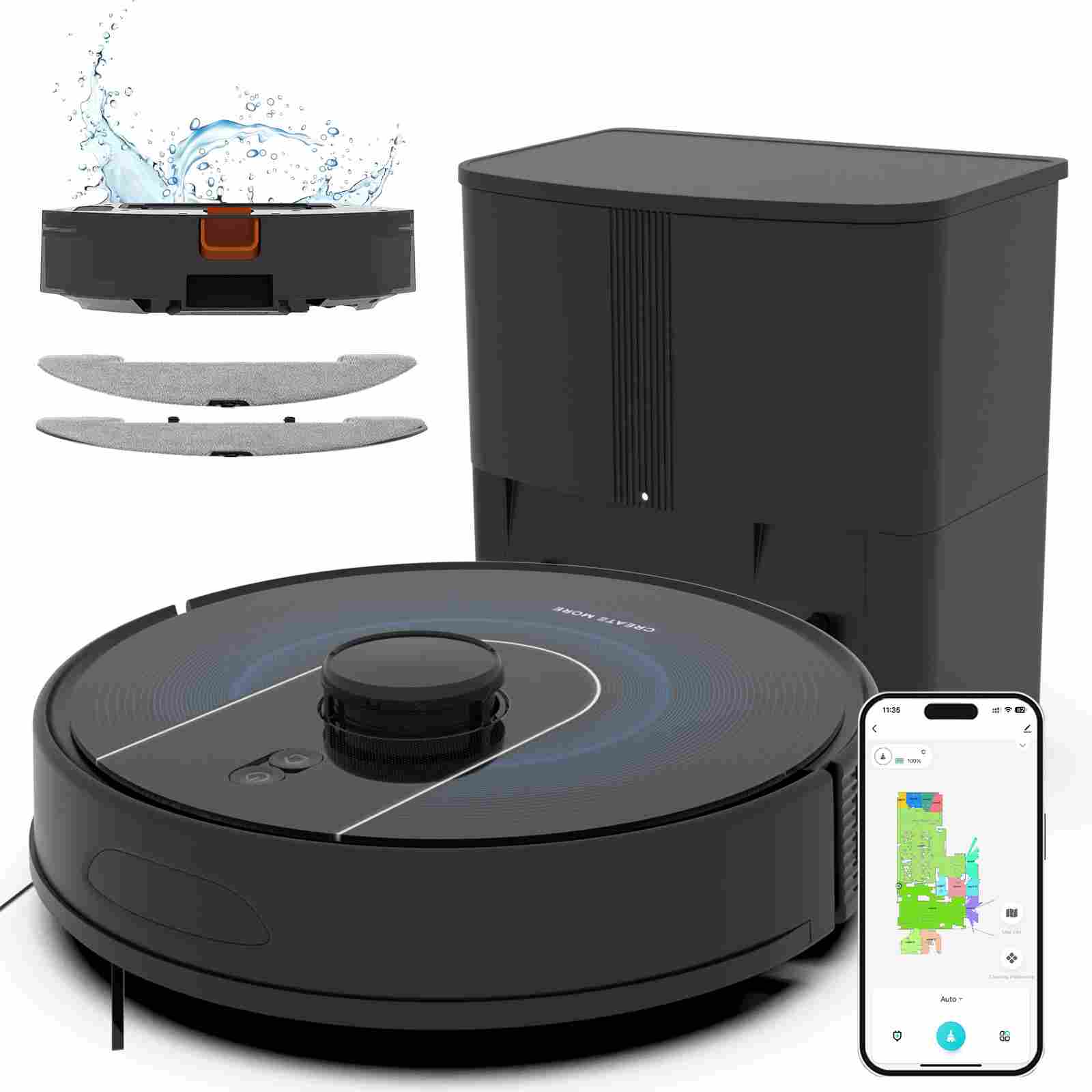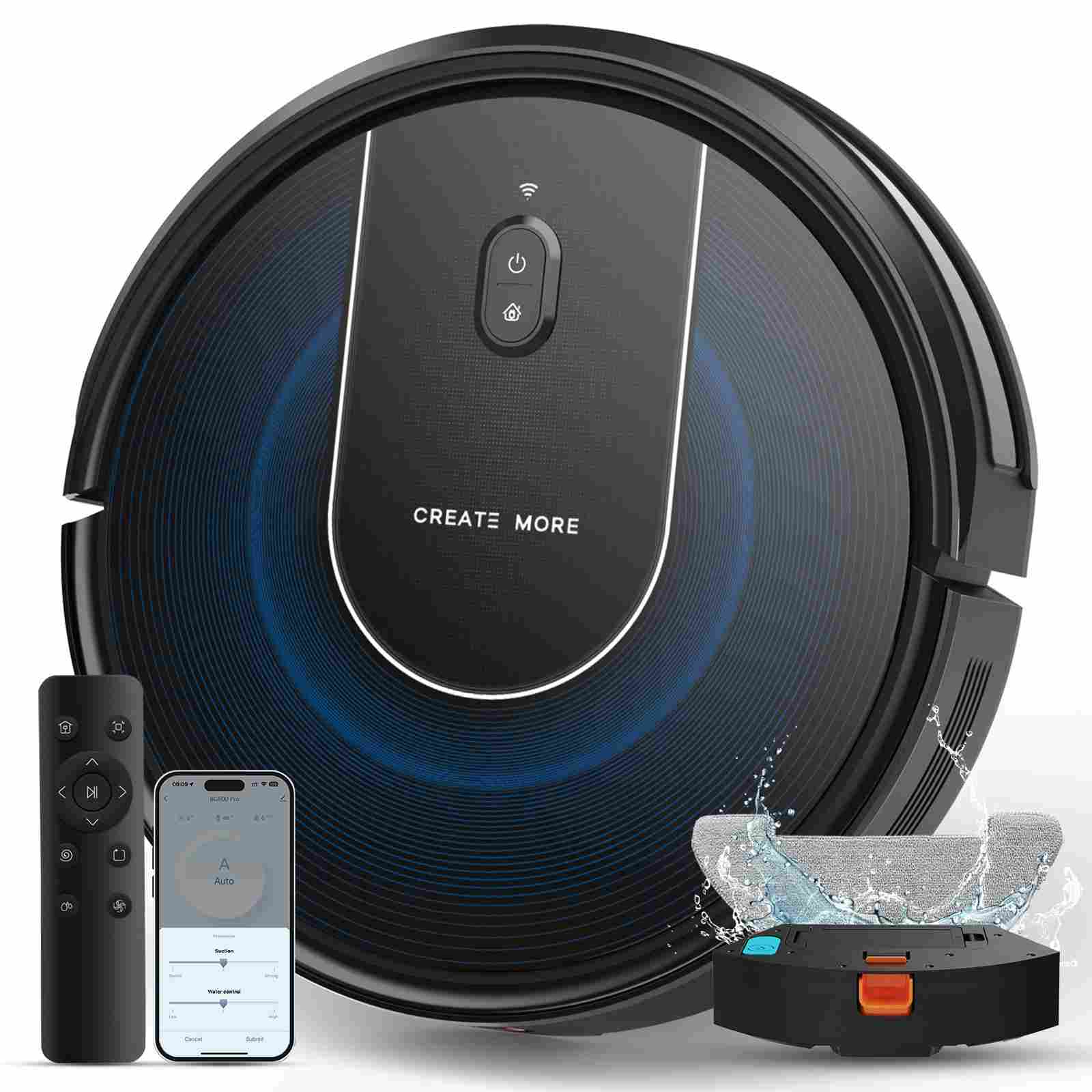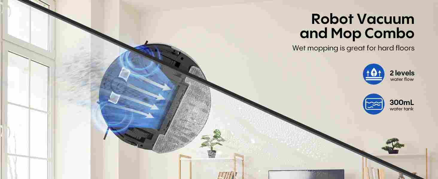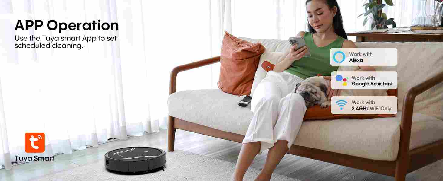 【Remote and Smart App Control】Easily control the robot vacuum cleaner via the remote control or the Tuya Smart App (requires 2.4GHz WiFi) or Google Assistant voice commands. You can adjust the cleaning direction, mode, suction power, and scheduled cleaning. View cleaning history, set cleaning schedules, adjust suction power and water level, etc., all of which can be easily achieved through the App.