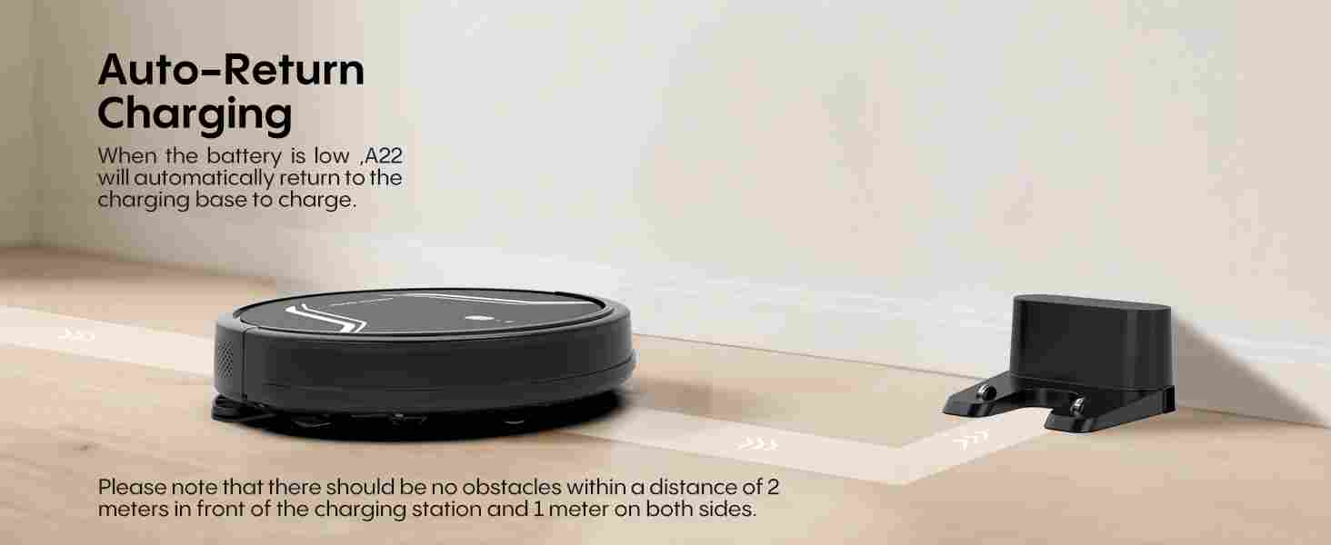 【Long Runtime and Automatic Charging】The A22 robot vacuum cleaner is equipped with a 2600 mAh high-capacity battery, which can clean continuously for 120 minutes at standard suction power. When the battery is low or cleaning is completed, it will automatically return to the charging base to charge, ensuring that it is always ready for the next cleaning task, ensuring that your home remains spotless every day.