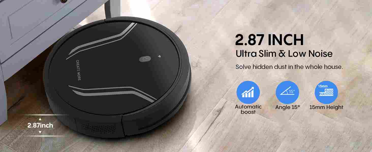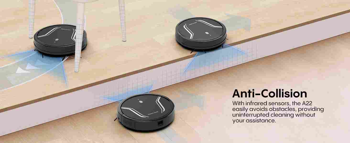【Smart Protection & Smooth Cleaning】With a thin design of 2.87 inches, the A22 can easily reach under furniture and narrow spaces for thorough cleaning. A full set of anti-fall sensors can intelligently identify and prevent the robot from falling from stairs or other falling objects. In addition, the A22 can climb up to 15 mm carpet or floor transition layers for uninterrupted cleaning.