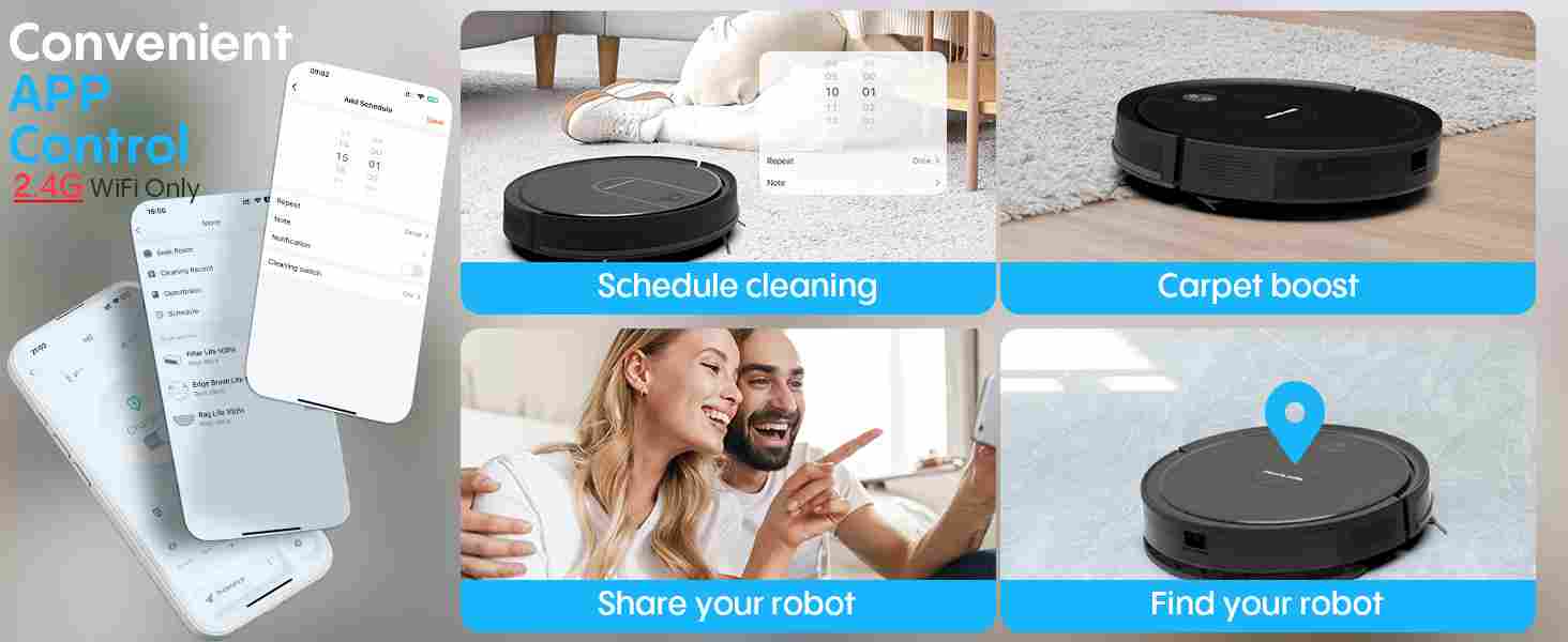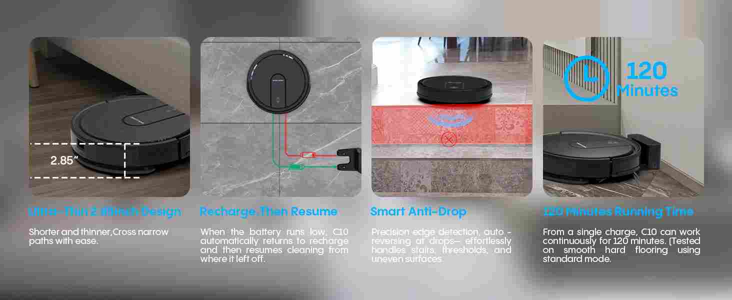 【Smart App & Ultra-thin Design】You can set a personalized cleaning plan through the App to meet your different needs. You can choose the cleaning time, suction power and cleaning mode. The ultra-thin design of 2.87 inches allows it to easily reach every corner of a small space and thoroughly clean without dead ends.