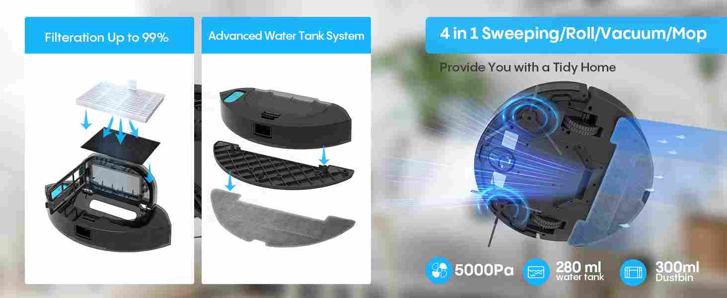 【4 in 1: Sweeping, Vacuuming, Mopping, Self-Charging】: This robot can not only quickly remove dust, paper, hair and other garbage, but also has a wet mopping function and a 290ml electric water tank, which can vacuum and mop at the same time. Shorten the cleaning time by 50% and improve cleaning efficiency.