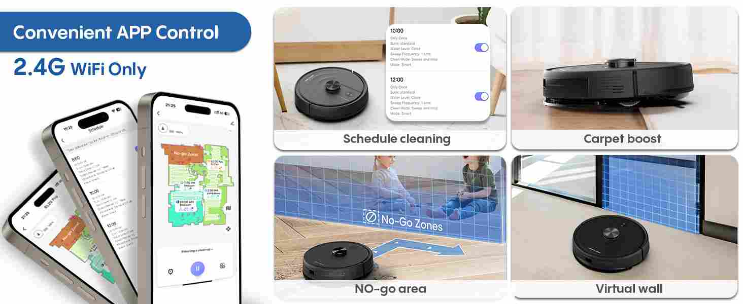 【Smart Voice and App Control】Fully free your hands, simple and convenient! Our smart robot vacuum and mopp can be easily controlled by voice commands or user-friendly mobile phone applications. Easily arrange cleaning tasks, select cleaning modes, suction power, water volume and customizable cleaning plans according to your different needs. Note: Only supports 2.4GHz Wifi.